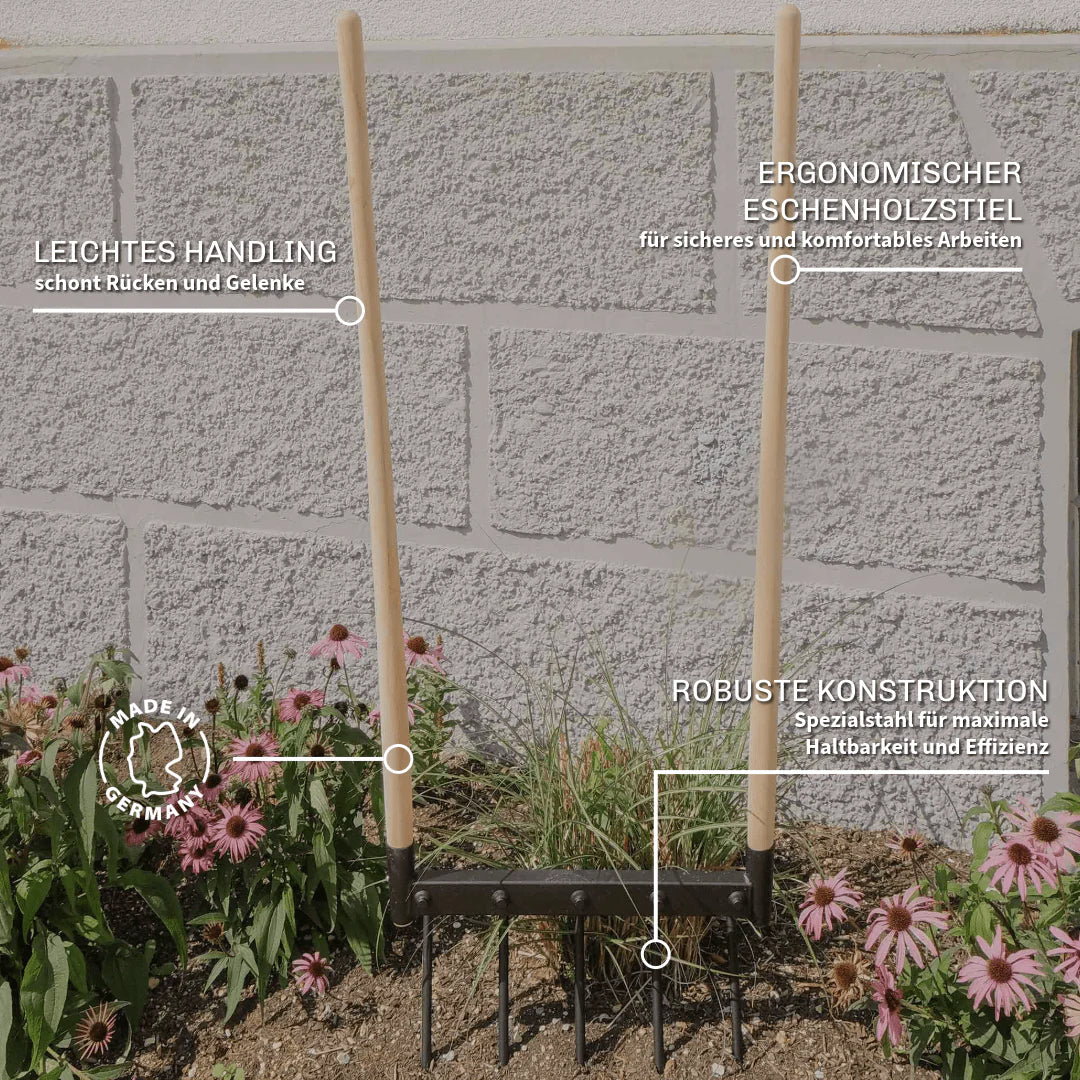 These tools are made by SHW in Friedrichstal near the Black Forest region of Germany and are designed to last a lifetime. The steel frame is very robust with heavy-duty forged tines (more than 1/2" thick) and can dig more than 11 inches into the ground.