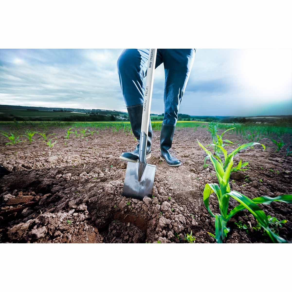 Professional-grade Havau Garden Spade with a 90-cm Ash T-Handle. Blade measures 28.5 x 18.0 x 18.5 cm. Weight approximately 2kg (5lbs)